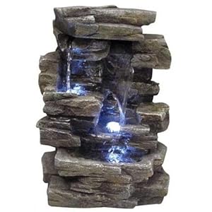 Alpine Tabletop Waterfall Fountain w/ Light has the look of natural stone. Made of durable resin. The streams of water flow to create a relaxing and meditative atmosphere. Alpine Tabletop Waterfall Fountain w/ Light includes super bright white LED energy-saving light. Create a relaxing and meditative atmosphere Includes super bright white LED energy-saving light Dimensions: 9L x 10W x 14H