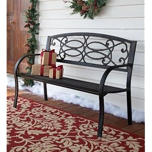 You won't find a better-looking or more durable bench at this price. Tubular steel is molded into a delicate, rounded shape with a slatted seat and backed with ornamental scrollwork in solid wrought iron. Corrosion-resistant powder-coat finish in black. Assembly required. Size: 50-1/2"L x 20"D x 34H.