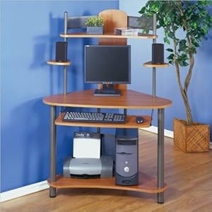 The Eagle Compact Computer Desk provides everything you need in a workstation in a convenient corner configuration. Form and function come together Features: Beautiful pewter and teak finish Great for desktop or laptops Rear privacy panels for stability Steel tube construction for durability Keyboard tray Floor levelers to adjust on uneven surfaces Ships ready to assemble Specifications: Overall dimensions: 56.5"H x 39.5"W x 24.75"D Top shelf: 30.5"W x 14.25"D Speaker shelves: 8"W x 6.5"D Main work surface: 39.5"W x 23"D Slide out keyboard shelf: 26.75" W Bottom shelf: 30.75"W x 17.25"D